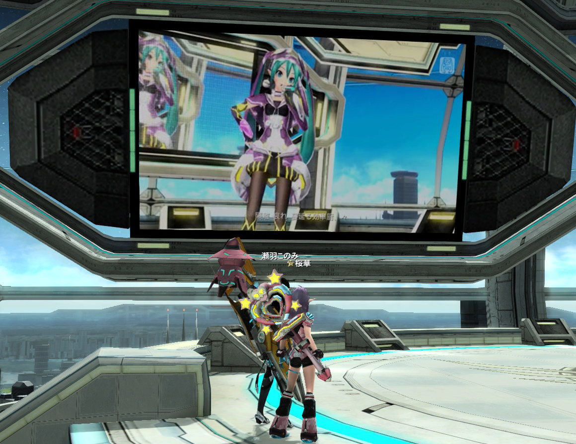 PSO2のシップ内ロビーのスクリーンにはミクさんがでかでかと映っていました。